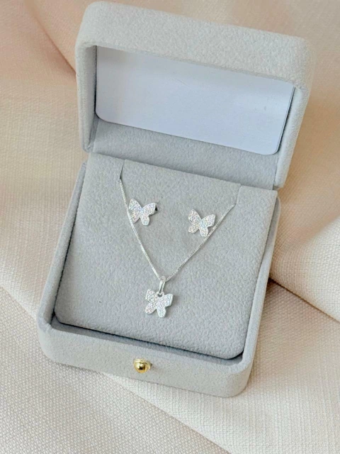 Adicione um toque de elegância e significado ao seu visual com o Conjunto Borboleta Cravejada Prata 925 45cm e sinta-se única em qualquer momento!