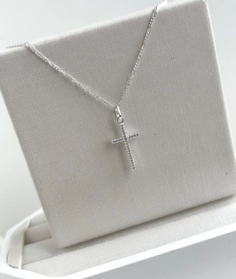 Descubra a sofisticação e o significado desta corrente confeccionada em Prata 925, com design elo 3x1 de 1mm, comprimento de 60cm, acompanhada de um delicado crucifixo cravejado que agrega charme e espiritualidade ao seu visual.